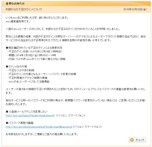 Mixiが2月28日に不正ログインの発生について重要なお知らせを掲載しました。ここでは2月28日に発生したと思われるMixiの不正ログインに関する情報について調べた内容についてまとめます。 Mixiで不正ログインが立て続けに発生 Mixiの不正ログインは2月上旬(2…