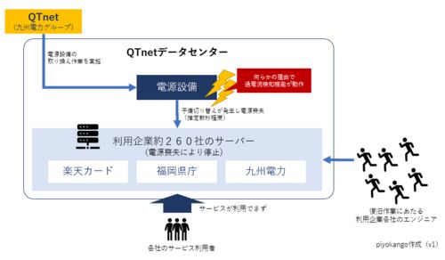 2019年11月23日朝、QTnetのデータセンターで電源設備のトラブルが発生し、これの影響を受け同センター利用各社のサービスが利用できない等の障害が発生しました。(24日時点で完全復旧はしていない)影響を受けた企業の内、楽天カードでは朝からカードが利用…