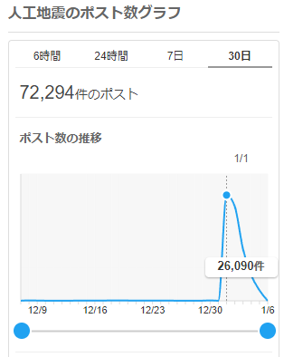 - 拡散状況として、2024年1月2日17時半頃までに否定する投稿も含め約25万件(NHK調べ)、2024年1月4日0時までには約37万件(朝日新聞調べ)の関連する投稿が行われており、850万回近く閲覧がされた投稿も確認された。*13 また人工地震や津波の軍事利用を禁じる国際条約に触れた投稿は約259万件の閲覧がされており、さらに投稿中に記載されていた条約を説明するサイトは投稿を通じ約14億回以上の閲覧がされていた。*14