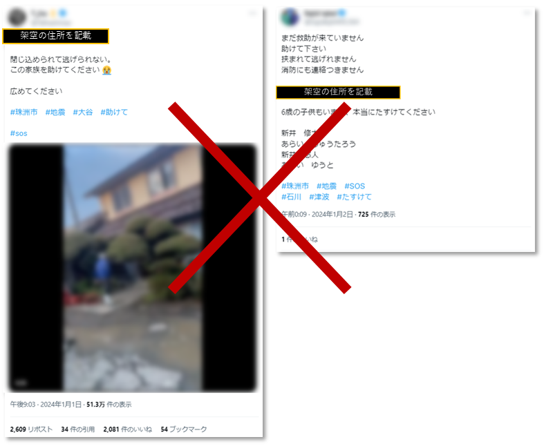 ♯助けて、♯能登地震、♯拡散希望などとハッシュタグをつけたり、能登半島地震とは直接関係のない画像を添付したりして、救助を呼びかける30件以上の投稿がX上に行われた。*15一部は実際に親族関係者が行った投稿だったとみられるが、それらの投稿を模した内容で投稿が複数行われていた。*16 「石川県川永市」など救助を要請する場所に架空の住所が含まれているものも複数確認された。 - 一部の模倣投稿を行っていたアカウントはその後救出されたなどとしてX上でPayPayでの寄付を呼び掛けており、寄付金と称した金銭詐欺目的の投稿だった可能性がある。*17 *18 投稿に対しては、実際に送金を行ったとする他の利用者の投稿もある。*19
