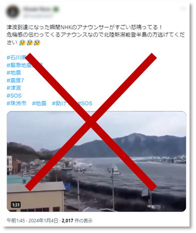 - 「津波到達となった瞬間NHKアナウンサーがすごい怒鳴っている!」2011年の東日本大震災で、岩手県宮古市の津波映像を加工したとみられる動画を用いて、今回の能登半島地震のものであるかのような投稿が行われた。*25 1月2日15時時点で約280万回表示、約3800件のいいねがつけられた投稿もあった。加えてまったく同文(かつ大半は同じ東日本大震災の津波動画を添付)の投稿が少なくとも30件以上、複数のアカウントより地震発生後から連日行われていた。