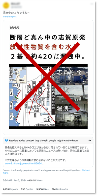 - 北陸電力の志賀原子力発電所が地震の影響を受けたとして、「放射性物質を含む水が2基で約420リットル漏洩中」という内容で投稿が行われ、添付された画像中にNHKのロゴが掲載されていた。(投稿は既に削除されている。)実際に1号機より約95リットル、2号機より約326リットルが使用済み燃料プールから放射性物質を含む水が底面に漏れたことが北陸電力より公表されているが、