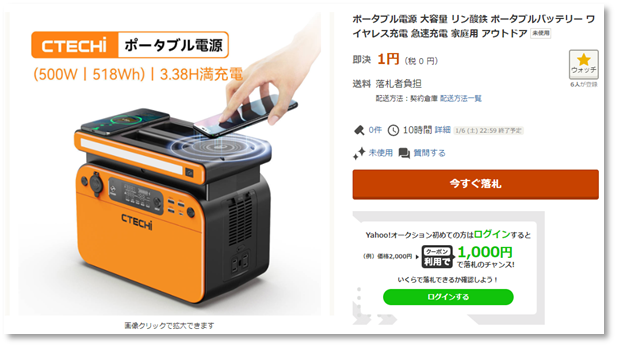 - 災害などの用途でも重宝されるポータブル電源について、ヤフオク上で即決1円で複数の出品が行われていた。いずれも送料は落札者負担となっている。同じ出品者からの購入者がつけているコメントには高額の送料を要求されたとする書き込みがあった。*26